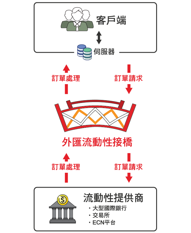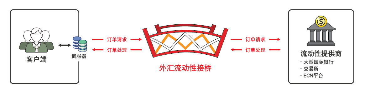 移动财经外汇流动性接桥服务将MT系统伺服器连接至流动性提供商(LP),协助券商对冲风险。系统可允许券商为个别客户群预定对冲规则以及将交易订单转移至合适的流动性提供商。