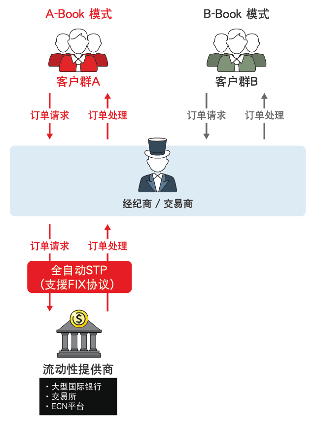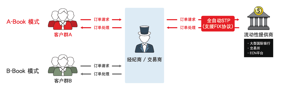 交易商和经纪商将客户仓位转移至流动性提供商,无需承担仓位风险,此模式通称为模式。而传统的模式,交易商和经纪商需自己承担仓位风险以赚取利润。