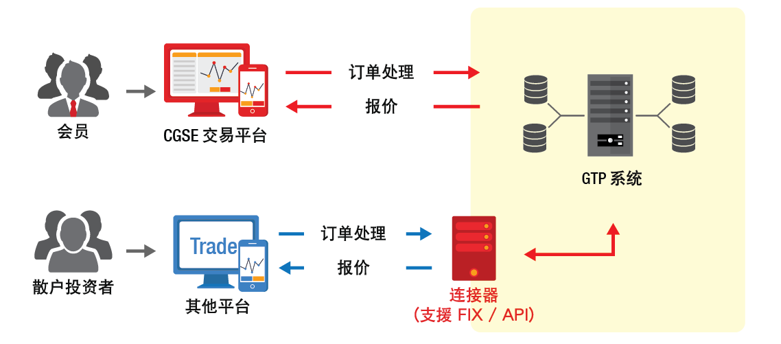 新的GTP交易系统支持金融信息交换协议(FIX) - 直通式处理系统(STP),允许行员将其客户的交易订单直接传送至金银业贸易场,并进行自动撮合交易。低延迟性的交易处理反馈程序,令订单快速成交,为用户提供更加优质的交易体验。